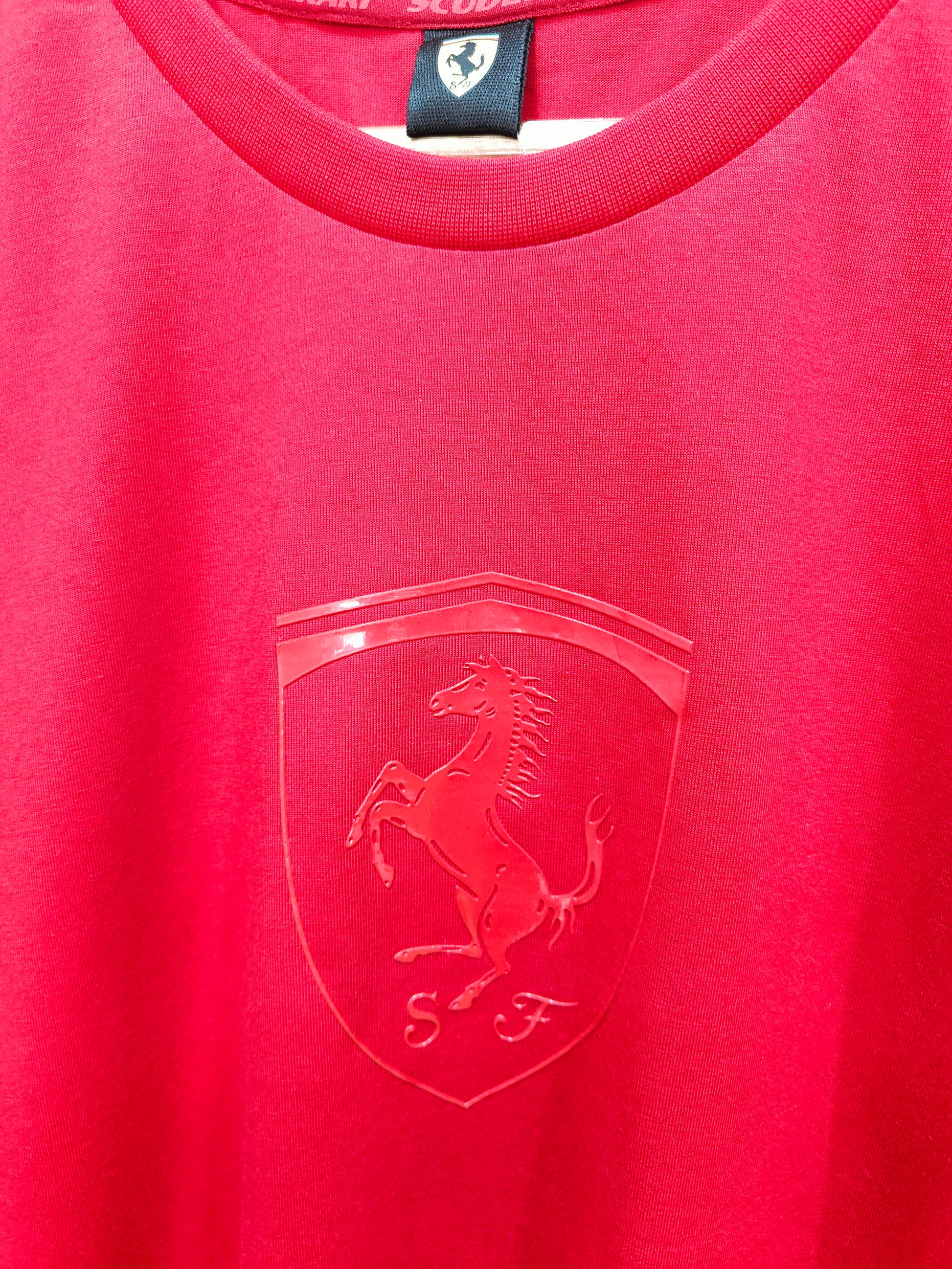 - Design: Minimalistic crew neck with embossed Ferrari “Prancing Horse” SF logo on the chest
