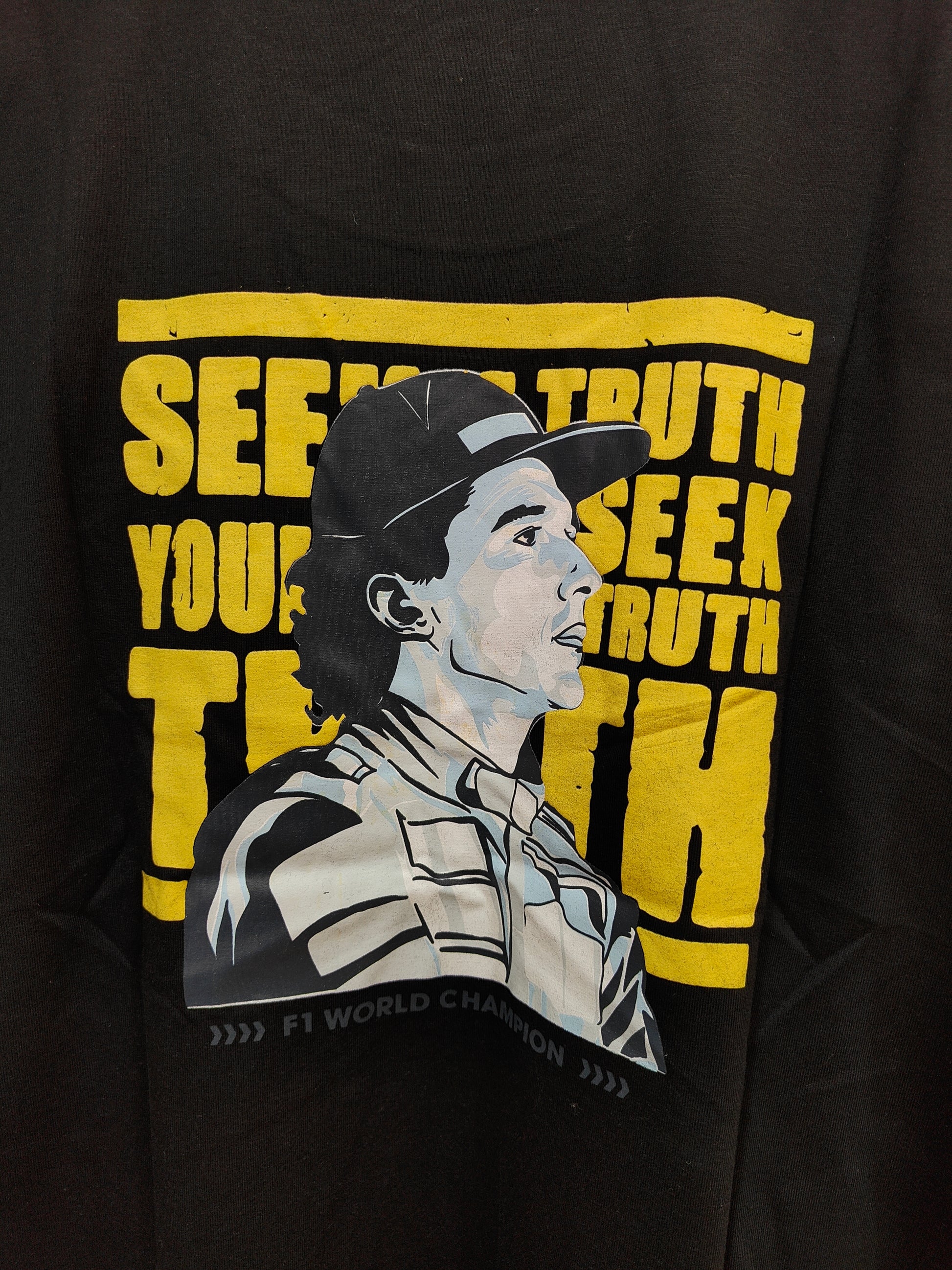 - Back: Ayrton Senna portrait + “SEEK TRUTH SEEK YOUR TRUTH” & “3x F1 World Champion 1991”
