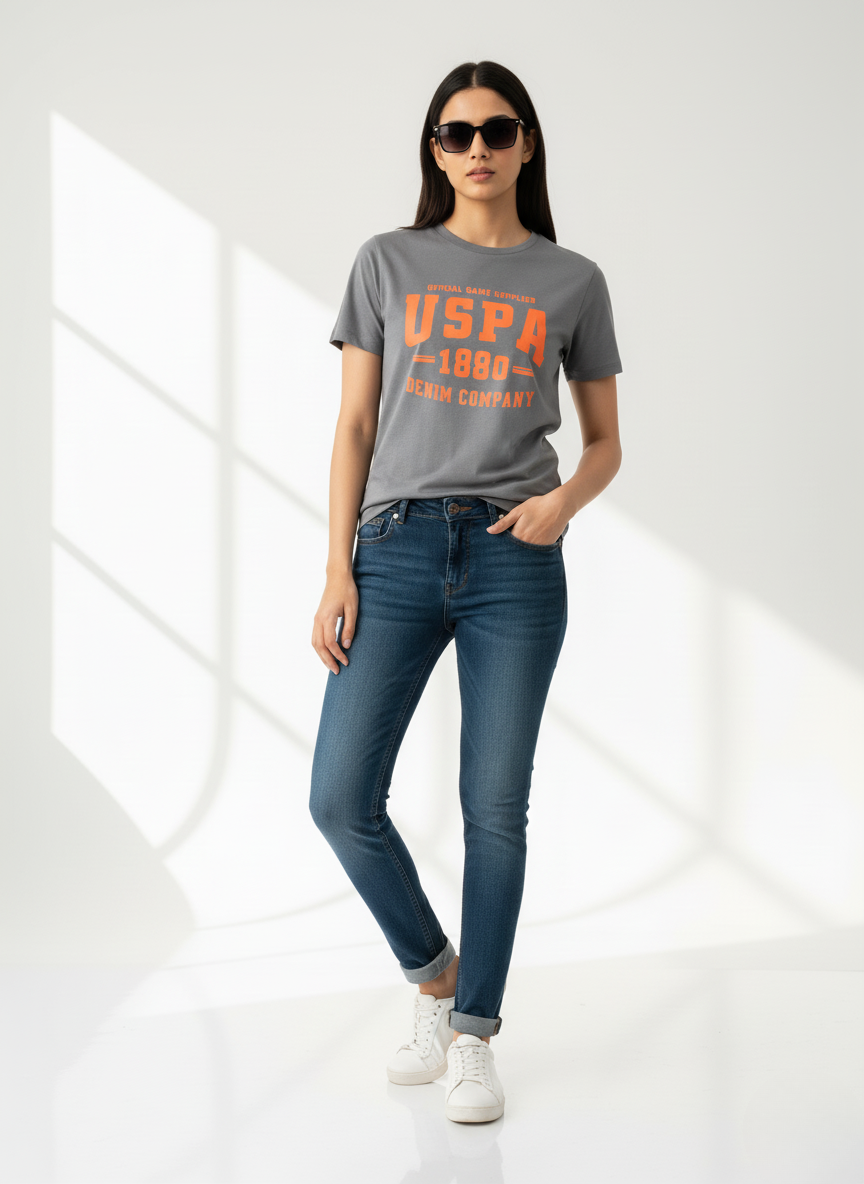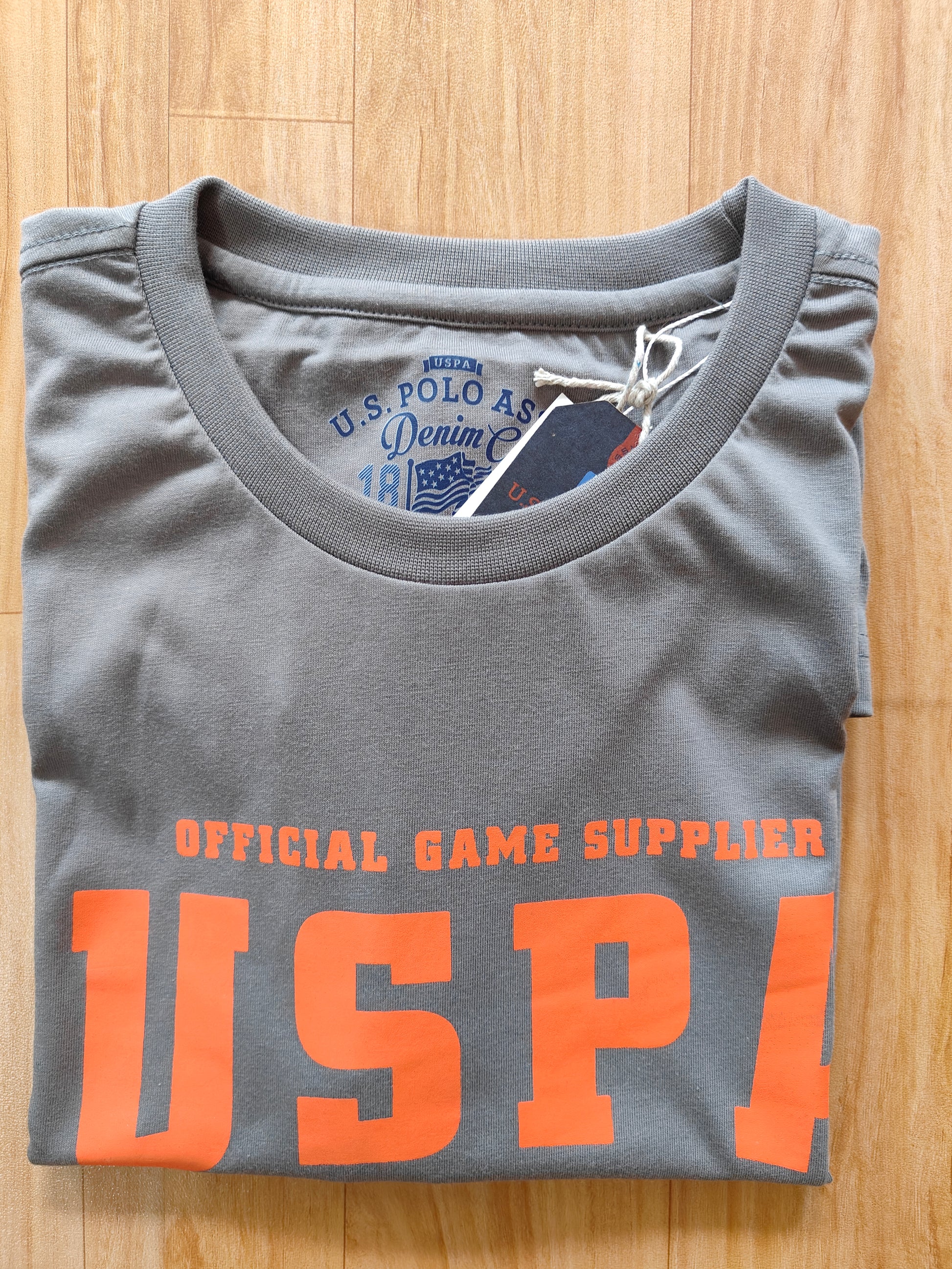- Color & Print: Dark gray base with a striking orange “U.S. Polo Assn. 1890 Denim Company” graphic on the chest
